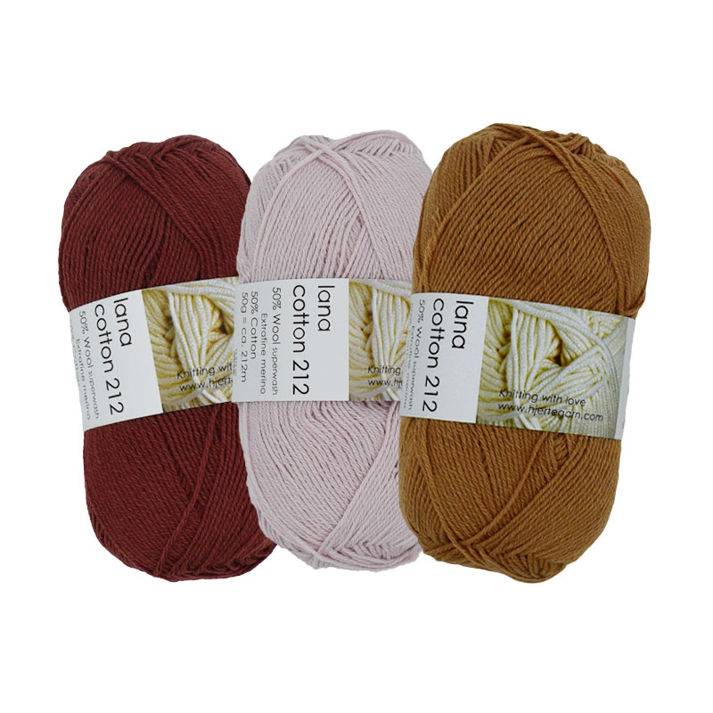 Lana Cotton 212 är en genomtänkt blandning av 50 % superwash extrafin merinoull och 50 % bomull. Merinoullen ger värme, elasticitet och mjukhet, medan bomullen bidrar med stadga och en sval känsla.